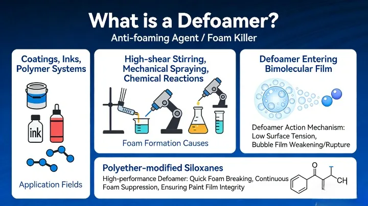 A defoamer, also known as an anti-foaming agent, is a chemical additive designed to inhibit the formation of foam and eliminate existing bubbles. During the production and application of coatings, inks, and polymer systems, air is easily trapped due to high-shear mixing, mechanical spraying, or chemical reactions, forming both macro-bubbles and micro-foam.